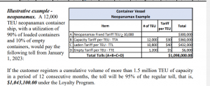 A queste si aggiungono 40 dollari a TEU per ogni container carico e 5 dollari a TEU per ogni container vuoto. Complessivamente, il pedaggio cumulato ammonta a oltre 1 milioni di dollari.
