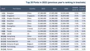 Nel 2022, i principali 30 porti del mondo hanno movimentato 454 milioni di TEU, con un incremento di poco meno dell’1% sul 2021.