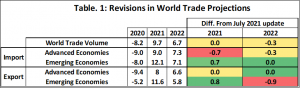 Le importazioni per le economie avanzate, anch’esse riviste al ribasso, cresceranno del 9% nel 2021 e del 7,3% nel 2022, mentre le importazioni per le economie emergenti dovrebbero crescere del 12,1% nel 2021 e del 7,1% nel 2022, con la proiezione del 2021 rivista al rialzo di 0,7 punti percentuali e quella per il 2022 rimasta sostanzialmente invariata.