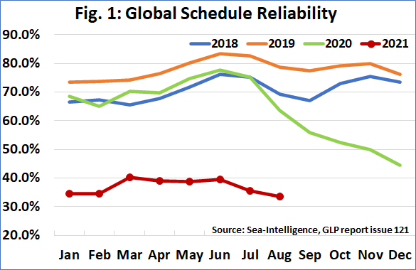 L’affidabilità degli orari delle linee di container globali è scesa al 33,6% ad agosto 2021. I vettori continuano a fare i conti con i problemi di congestione di cui stanno soffrendo molti scali portuali, specie quelli statunitensi, con la carenza di container vuoti e una domanda di mercato in crescita sostenuta.