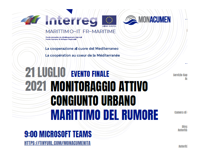Per dare conto dei risultati raggiunti in tre anni di attività, l’AdSP ha organizzato su Microsft Teams un evento finale che si terrà il prossimo 21 luglio e a cui parteciperanno tutti i protagonisti del progetto: oltre all’AdSP dell’Alto Tirreno, Mon Acumen coinvolge l’AdSP del Mare di Sardegna, l’Autorità di Sistema Portuale del Mar Ligure Orientale, l’Agenzia Regionale per la Protezione Ambientale Toscana, la Camera di Commercio e dell’industria di Bastia e l’Università di Genova.