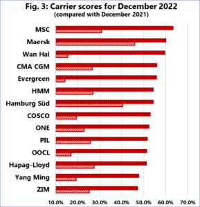 Dieci carrier (Wan Hai, CMA CGM, Evergreen, HMM, Hamburg Sud, Cosco, ONE, PIL, OOCL, Hapag Lloyd) hanno fatto registrare una reliability compresa in una forbice tra 50 e il 60%. Soltanto Yang MIng e ZIM hanno avuto un’affidabilità inferiore al 50%.