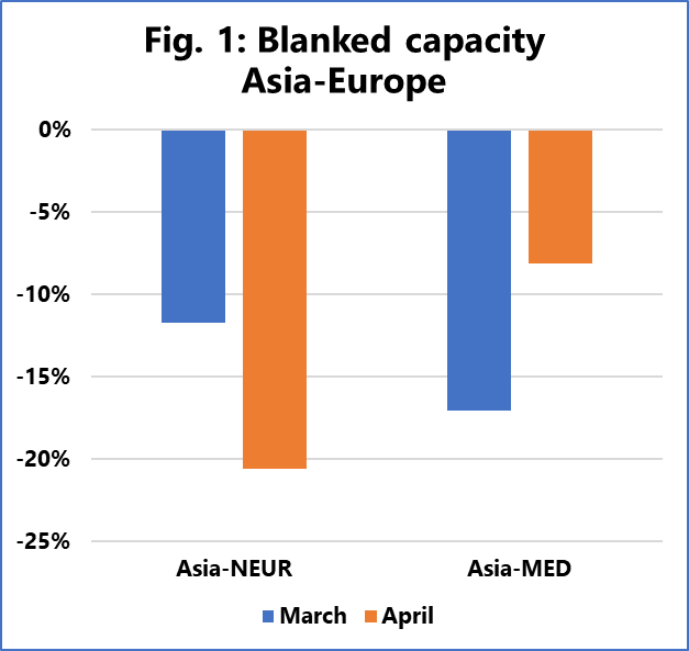 Sea Int. fa infatti notare come lungo la rotta Asia-Nord Europa sia stato annullato complessivamente ad Aprile il 21% delle partenze programmate, con un incremento notevole rispetto al mese precedente, durante il quale era stato registrato un blank share del 12%.