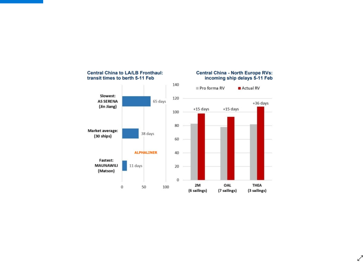 Nonostante un calo generale del numero di navi in attesa di attracco a Los Angeles/Long Beach da un picco di 109 unità del 9 gennaio scorso a “solo” 76 navi all’inizio di questa settimana (14 febbraio), il tempo di transito in fronthaul per le navi che salpano dall’Estremo Oriente verso questi due porti ha toccato una media di 38 giorni, in aumento di dieci rispetto ai 28 giorni registrati a Novembre.