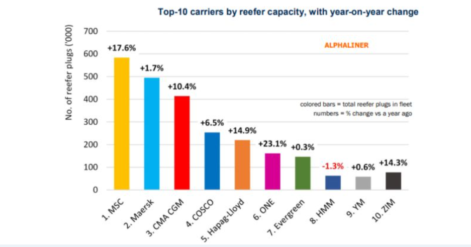 La classifica dei primi 10 carrier per spine refrigerate segue generalmente la classifica per capacità totale della flotta. L’unica eccezione è rappresentata da ZIM, che pur trovandosi al decimo posto nella classifica dei top ten per la capacità espressa complessivamente dalla propria flotta, occupa l’ottavo posto nella classifica dei top-10 nel settore del reefer. Le sue 130 navi sono dotate di quasi 77.700 spine refrigerate.
