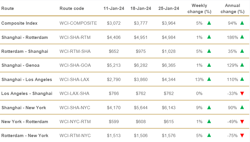 Questa settimana le tariffe di trasporto marittimo sono aumentate in media del 5% rispetto a quella precedente, a 3.964 dollari per ogni container da quaranta piedi trasportato.