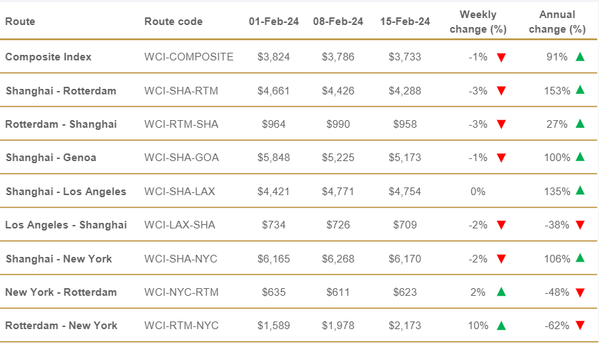 Le rate su Shanghai-Genova sono calate dell’1 % rispetto alla settimana scorsa, a 5173 dollari a FEU, mentre i noli su Shanghai – Rotterdam e su Rotterdam Shanghai sono entrambi diminuiti del 3 ciascuno%, rispettivamente a 4288 e 958 dollari a FEU. In contrazione anche i noli sulla Los Angeles – Shanghai e Shanghai – New York, diminuiti entrambi del 2% su base settimanale, a 709 e 6170 dollari a FEU.