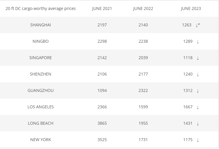 Secondo Container xChange, i prezzi dei container sono scesi ai livelli più bassi degli ultimi tre anni. A New York, ad esempio, il prezzo medio di un container da venti piedi ha raggiunto nella prima settimana di Giugno i 1175 dollari. Nello stesso mese di due anni fa, un contenitore da venti piedi valeva 6500 dollari.