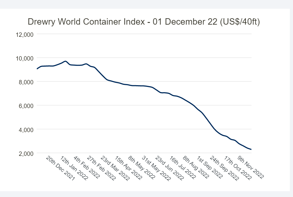 Sembra non arrestarsi più la caduta dei noli spot sul mercato del trasporto marittimo di container. L’indice composito del World Container Index di Drewry è diminuito del 5% sulla settimana precedente, a 2284 dollari per container da 40 piedi e resta inferiore del 78% rispetto al picco raggiunto a Settembre 2021, quando le rate avevano raggiunto un valore medio di 10377 dollari a FEU.