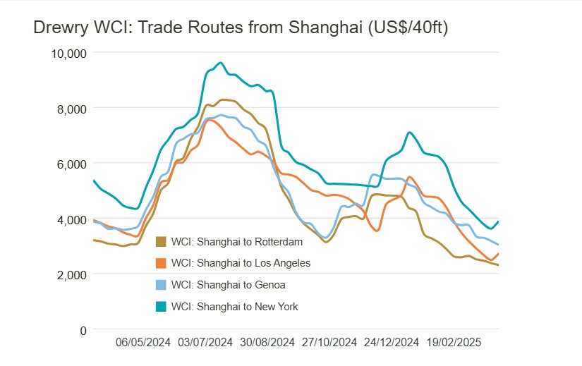 I noli sulla Shanghai – Rotterdam sono diminuiti del 3%, a 2304 dollari a FEU, mentre sulla New York – Rotterdam e sulla Rotterdam – New York sono calati entrambi del 2%, a 831 e a 2124 dollari a FEU.
