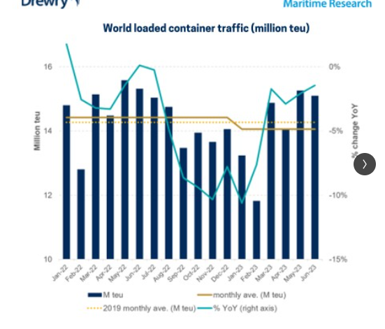 “Gli ultimi anni hanno visto una notevole volatilità dei tassi di crescita, cosa, questa, che potrebbe indurre gli analisti a credere a un lungo periodo di debolezza del mercato” afferma Simon Heaney, senior manager di Drewry. “Va precisato però che il rallentamento del commercio di quest’anno ha portato il totale mondiale medio mensile da inizio anno a valori di poco inferiori a quelli del pre-pandemia, appena l’1,4% in meno”.
