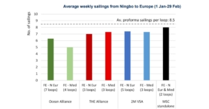 Tuttavia, sebbene il mercato soffra da tempo di un problema di overcapacity di stiva, trovare nuove navi da immettere nei circuiti Asia – Europa non è sempre un’impresa facile. Nella sua analisi, Alphaliner sottolinea come Ocean Alliance sia l’alleanza armatoriale che sta avendo maggiori difficoltà a reperire nuovo tonnellaggio da dislocare nei servizi di collegamento lungo le direttrici est-ovest. Considerata una media ottimale di 8,5 viaggi settimanali per servizio di collegamento, la consultancy firm francese indica come per i circuiti Far East – Nord Europa (7 loop) e Far East – Mediterraneo (4 loop) l’alleanza operativa composta da CMA CGM, Cosco, Oocl ed Evergrenn abbia schedulato tra il 1° gennaio e il 29 febbraio rispettivamente sei e cinque viaggi settimanali.