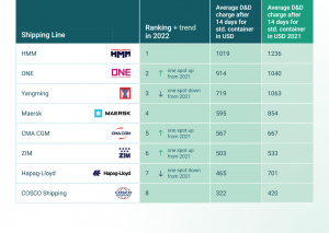 Quanto alle shipping line, tra le otto analizzate, la compagnia cinese Cosco è quella che mediamente applica le tariffe d&d più basse: 322 dollari alla fine dei 14 giorni di permanenza. Penultima e terzultima posizione per Hapag Lloyd e ZIM, rispettivamente con 465 dollari e 503 dollari. La compagnia più cara risulta essere HMM, con una tariffa d&d media di 1019 dollari.