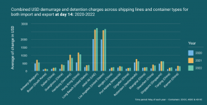Se dal 2020 al 2021, gli extra costi per la detenzione dei container oltre il periodo di franchigia sono aumentati del 79%, da una media di 390 dollari a un picco di 700 dollari, nel 2022 la riduzione delle tariffe è stata meno marcata di quanto fatto registrare altrove: di appena il 12,2%, a 614 dollari.