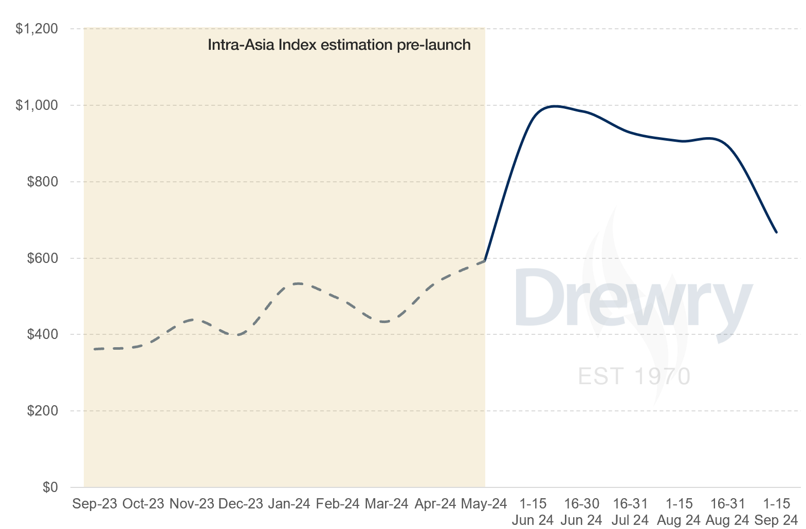 La Drewry ha notato una crescente volatilità nei tassi spot intra-asiatici negli ultimi anni, con tassi in forte aumento quest’estate e ora in forte correzione al ribasso con l’indebolimento della domanda regionale.