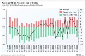 La società di analisi ha fatto osservare come la tratta tra il Nord Europa e la costa orientale del Sud America, non operativamente interessata dal Mar Rosso, abbia registrato un punteggio CEI di 114,4 nel secondo trimestre del 2025, in aumento del 15% rispetto all’anno precedente.