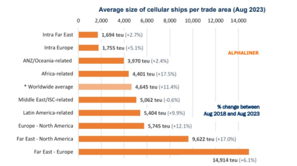 However, despite many 24,000 TEU ships being delivered over the last few months, the average size of vessels on this trade route has only grown by 6.1% since 2018, well below the average growth of the total world fleet (11.4%).