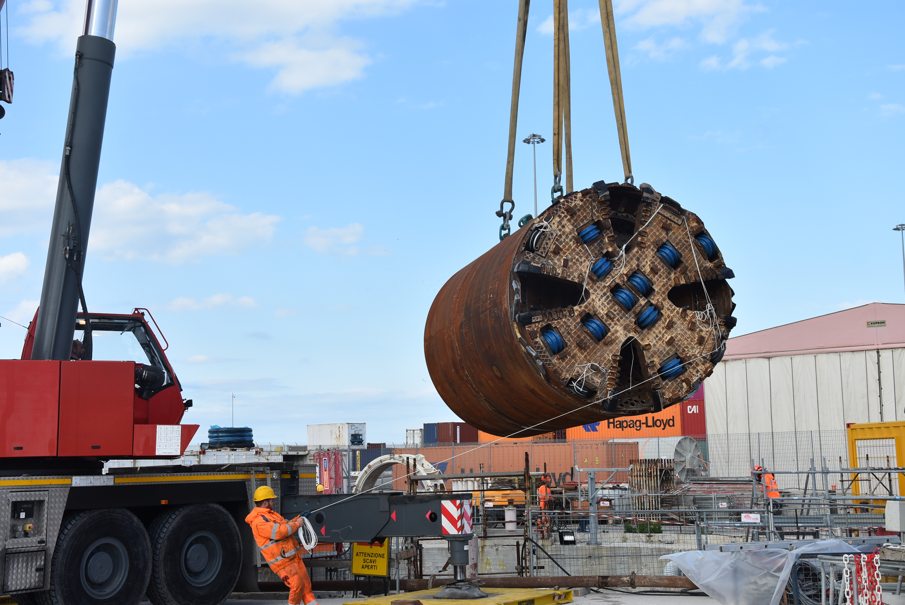 Livorno- preparations for the excavation work on the Microtunnel are underway. In the construction site opened in front of the Marzocco Tower, on the west bank of the Darsena Toscana, the cutting head of the mechanical ‘mole’ that will dig the tunnel between the two banks of the port’s harbour access channel was lowered this morning.