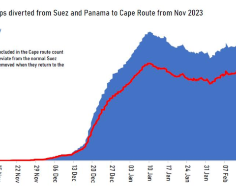 403 boxships, i.e. 5.14 million Teus, have been rerouted to the Cape of Good Hope since November