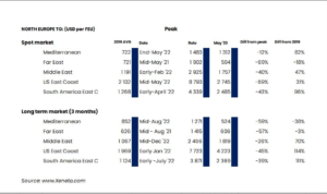 I caricatori che esportano carichi verso il Medio Oriente e la costa orientale sudamericana hanno affrontato i rispettivi picchi di prezzo all’inizio di febbraio e all’inizio di aprile 2022. Da quel momento le tariffe sono diminuite del 40% e del 43% per le due rotte.