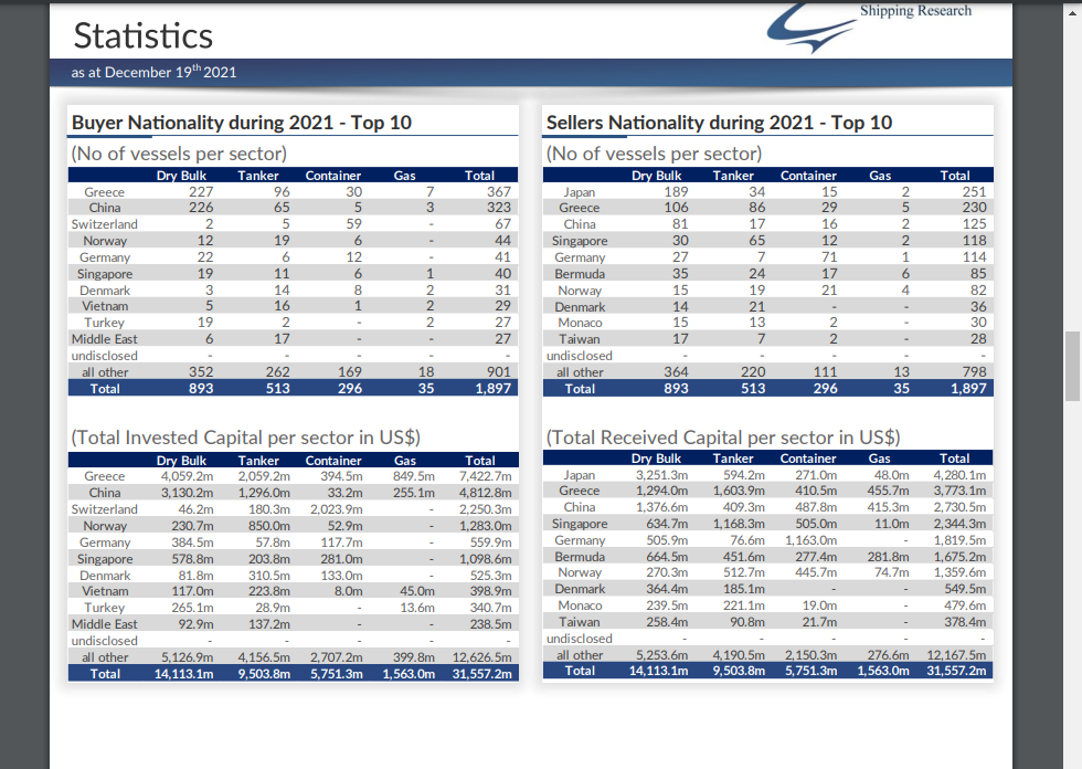 La divisione di ricerca del broker marittimo ha affermato che i greci hanno acquisito 367 navi, seguiti da proprietari con sede in Cina con 323 acquisti.