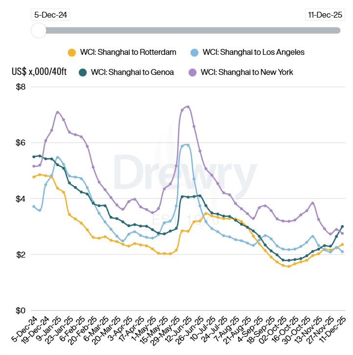 Nel dettaglio, le tariffe sulla Shanghai – Genova si sono impennate del 13%, a 3004 dollari a FEU, mentre da Shanghai a Rotterdam sono cresciute del 5%, a 2361 dollari a FEU. Tale situazione si spiega, secondo Drewry, con la crescita sostenuta della domanda nel mese di dicembre. Non solo, con il Capodanno lunare che cadrà a febbraio 2026, i vettori stanno già registrando prenotazioni anticipate, ed è quindi probabile che possano registrarsi ulteriori aumenti tariffari la prossima settimana.