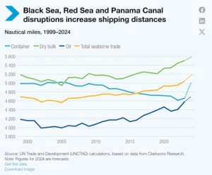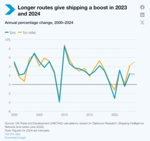 Le tonnellate-miglia globali sono aumentate del 4,2% nel 2023, facendo aumentare i costi e le emissioni. Nella prima metà del 2024, il reindirizzamento delle navi dal Mar Rosso e dal Canale di Panama ha contribuito ad aumentare la domanda globale di navi del 3% e quella di navi portacontainer del 12% rispetto ai periodi pre-crisi.