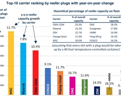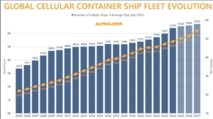 Con l’aumento dell’attività di ordinazione nel terzo e quarto trimestre dello scorso anno, Alphaliner prevede che entro il 2027 la flotta raggiungerà le 6700 unità e una capacità media ad unità di 5400 TEU.