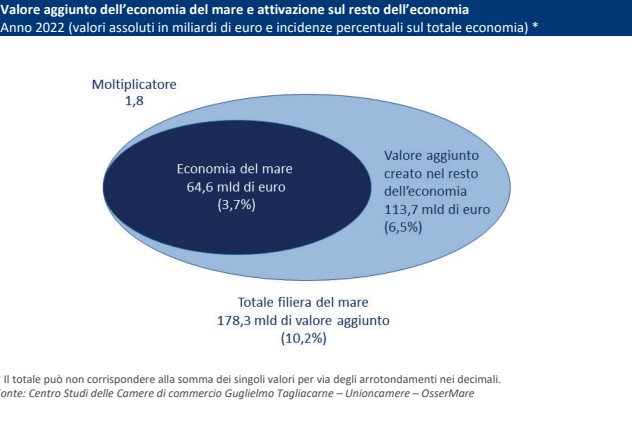 Nel 2022, il valore aggiunto prodotto e attivato dal “Sistema Mare” ha raggiunto i 178,3 miliardi di euro, ovvero il 10,2% del totale del valore aggiunto del sistema economico nazionale.