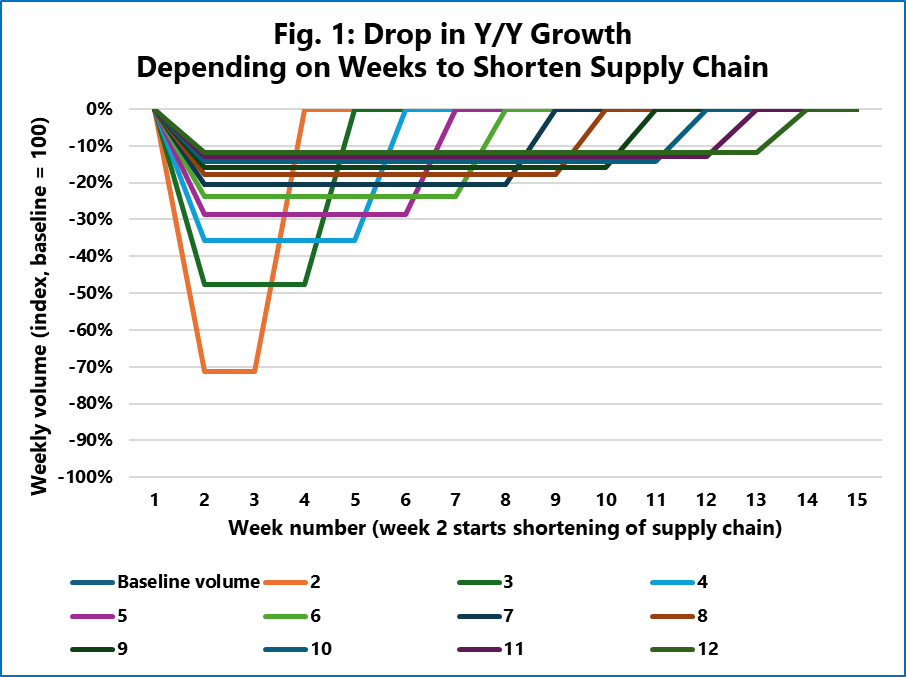 Gli analisti inglesi hanno previsto una serie di scenari che variano a seconda del tempo che impiegherà la catena logistica a riaccorciarsi (si veda la figura in evidenza). “Nel caso di una contrazione irrealistica di 2 settimane, vediamo come la domanda scenda di 70 punti percentuali su base annuale. In considerazione di un periodo di transizione di 12 settimane, potrebbe verificarsi una riduzione della crescita annuale del commercio sul trade Asia-Europa di oltre 10 punti percentuali” afferma il Ceo di Sea Intelligence, Alan Murphy.