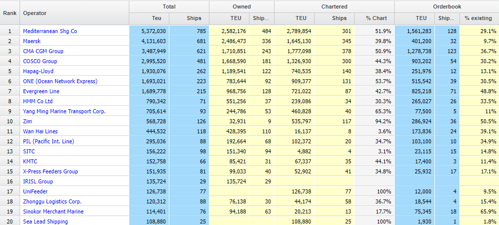 MSC detiene la maggiore capacità in termini di navi di proprietà, che rappresentano il 61,6% della capacità complessivamente dispiegata dal gruppo di Aponte. Il vettore danese possiede invece 336 navi di proprietà, poco meno del 50% del totale.