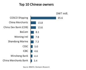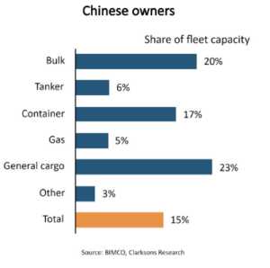 Gli armatori cinesi controllano una quota minore di navi cisterna e gasiere, ma gestiscono una quota maggiore di merci generali e flotte di container, con COSCO Shipping che contribuisce alla quota maggiore della flotta di container.