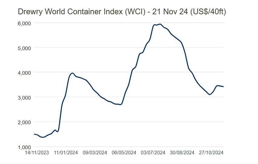 Lo rivela Drewry nel suo ultimo report. I noli rimangono comunque del 140% superiori ai valori pre-pandemici, anche se sono al di sotto del 67% rispetto al picco dei 10.377 dollari raggiunto a settembre del 2021.