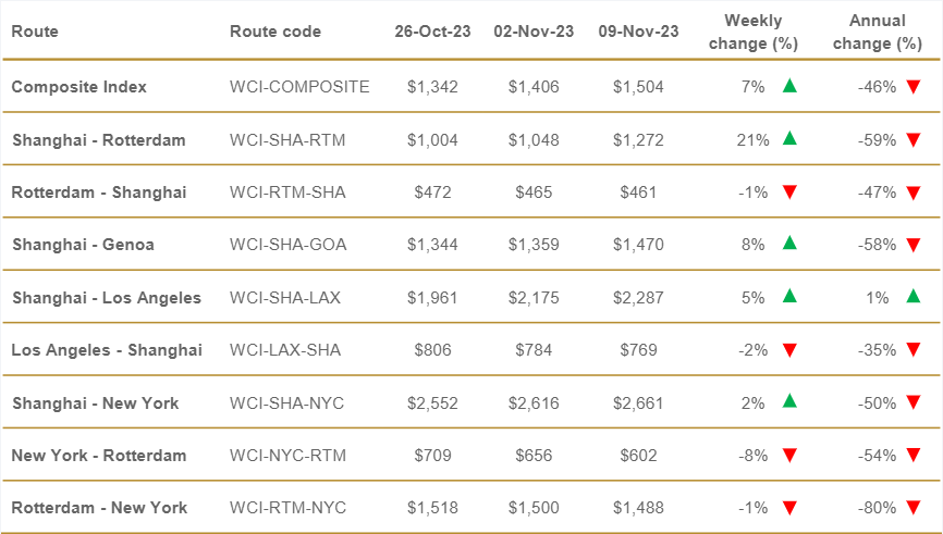 Dopo essere aumentati del 5% la settimana precedente, i noli container sulle otto principali rotte da e per Stati Uniti, Europa e Asia, hanno messo a segno questa settimana un altro risultato positivo, crescendo del 7%, a una media di 1504 dollari per ogni container da quaranta piedi trasportato.