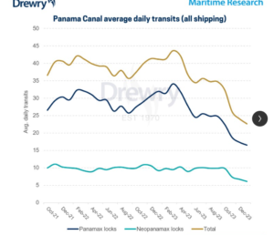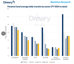 Drewry fa notare come nel mese di gennaio il numero di transiti medi giornalieri per tutte le navi commerciali sia sceso a 22,6, con una tendenza ribassista iniziata ad aprile del 2023, quando l’ACP ha cominciato a introdurre le misure di risparmio idrico.