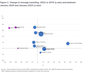 Panama soffre evidentemente di una crisi strutturale che i lavori di espansione del 2016 non hanno contribuito a risolvere. Il confronto tra il 2023 e il 2024 (asse x) riflette chiaramente la situazione congiunturale. Il tonnellaggio in transito da questi due choke point è diminuito in modo sostanziale.