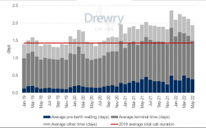 Nel Ports & Terminals Insight si evidenzia come la durata media delle chiamate nei principali porti del Northern Range sia aumentata di oltre il 50% nel primo trimestre del 2022 rispetto allo stesso periodo del 2019, per poi attestarsi, a Maggio, attorno al 37%.