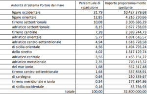 Le risorse sono state assegnate a ciascuna autorità portuale per una quota parte dell’80% – pari a 32,8 milioni – con un criterio proporzionale all’imposta sul valore aggiunto effettivamente prodotta in ciascun sistema portuale e per il restante 20% – pari a 8,2 milioni – secondo un criterio perequativo inversamente proporzionale all’imposta prodotta in ciascun porto.
