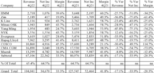Hapag Lloyd si è classificata terza, con un utile netto di 3,295 miliardi. Quarto posto per CMA CGM, il cui reddito netto è stato pari a 3,04 miliardi, 3 mld in meno rispetto a quanto realizzato nel Q4 2022.