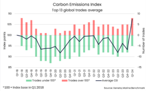 Nei collegamenti dall’Estremo Oriente al Nord Europa, il tasso di inquinamento prodotto dalle navi è aumentato in misura minore, del 23,3% rispetto ai valori del quarto trimestre del 2023. Il sotto indice CEI ha comunque raggiunto i 111 punti. Non poco.