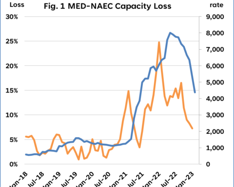 La fotografia scattata nel presente da Jensen nulla dice, chiaramente, delle strategie che i big carrier vorranno adottare in futuro per contrastare il trend ribassista delle rate di nolo. Le riduzioni programmate della capacità di stiva sono da sempre l’arma migliore di cui dispongono i carrier per rafforzare il proprio posizionamento competitivo nel mercato ed è quindi probabile che in vista di un inizio di autunno ricco di incognite tornino presto a crescere.