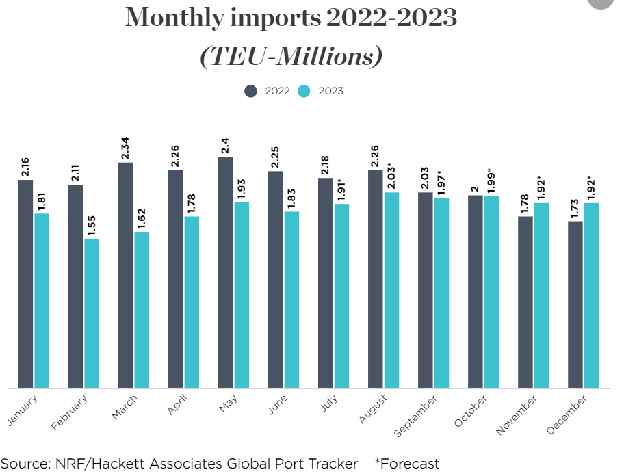 I porti non hanno ancora fornito i dati di Luglio ma il Global Port Tracker ha previsto per questo mese una movimentazione allo sbarco di 1,91 milioni di TEU, facendo registrare un calo del 12,7% sullo stesso mese del 2022. A Giugno i volumi in import si sono invece attestati attorno agli 1,84 mln di TEU, in calo del 18,7% su base annuale. Complessivamente, nella prima metà del 2023 sono attesi all’import 10,5 mln di TEU, con un decremento del 22% rispetto allo stesso periodo del 2022.