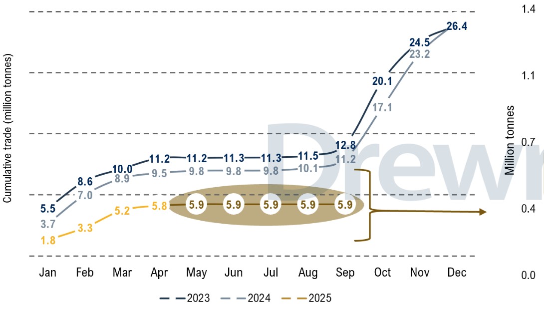Se ottobre e novembre seguissero lo stesso andamento di settembre, senza spedizioni, le tariffe di trasporto Panamax potrebbero pertanto subire una notevole pressione al ribasso.