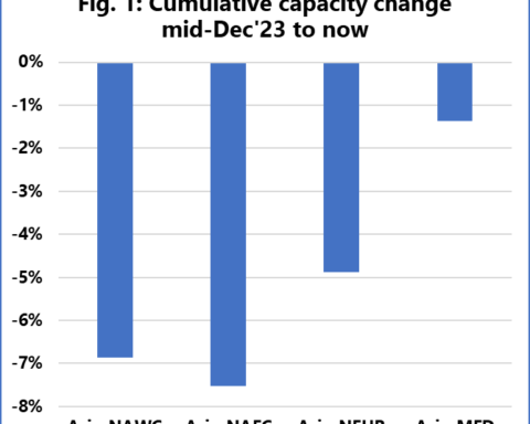 8 Febbraio 2024 News Mar Rosso, impatto limitato sulla capacità Secondo Sea Intelligence, la capacità offerta si è contratta di appena l'1,4% sul trade tra l'Asia e il Mediterraneo