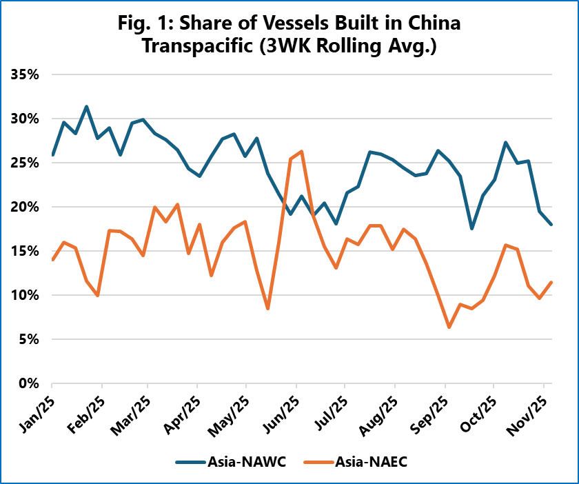 Sulla rotta transpacifica, si notano i primi segnali di una riduzione nell’impiego di navi di costruzione cinese. Come mostrato nella Figura 1, per la rotta Asia-Nord America, la quota di navi di costruzione cinese ha registrato un andamento decrescente, passando da un livello del 25-30% nella prima metà del 2025 a un intervallo del 20-25% nelle ultime settimane. Una tendenza simile, sebbene meno pronunciata, è osservabile sulla rotta Asia-Nord America, lungo la rotta orientale.