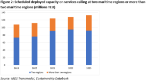 MDS Transmodal fa osservare come sia andata significativamente diminuendo nel corso dell’anno la presenza dei liner lungo quelle grandi rotte commerciali che collegano soltanto due regioni marittime e pochi scali portuali. Su questi trade la capacità impiegata è diminuita complessivamente del 3,1% su base annuale e sono diminuiti anche i servizi di collegamento: ne sono stati soppressi ben 17 dall’inizio del 2023.
