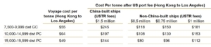 Una nave con una stazza lorda compresa tra le 7500 e le 9999 tonnellate spende oggi in media 55 dollari a tonnellata per effettuare questo viaggio. Ipotizzando che sia cinese e che quindi debba pagare 1,5 mln di dollari di extra tasse per ogni scalo effettuato in USA, la stessa nave andrebbe a spendere 245 dollari a tonnellata. Mentre se non fosse stata realizzata in Cina, i costi potrebbero ammontare attorno una forbice compresa tra i 118 e i 181 dollari a tonnellata, a seconda del quantitativo di navi cinesi presenti nella flotta o nel portafoglio ordini dell’operatore che gestisce quella nave.