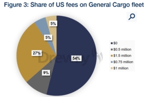 L’analisi della flotta general cargo oggi impiegata nei servizi di collegamento da e per gli USA evidenzia come il 54% di queste navi (3514 unità) risulti esente dal pagamento delle tasse, non essendo state realizzate in Cina e non essendo gestite da operatori che hanno nel proprio portafoglio ordini o nella flotta navi di provenienza cinese.